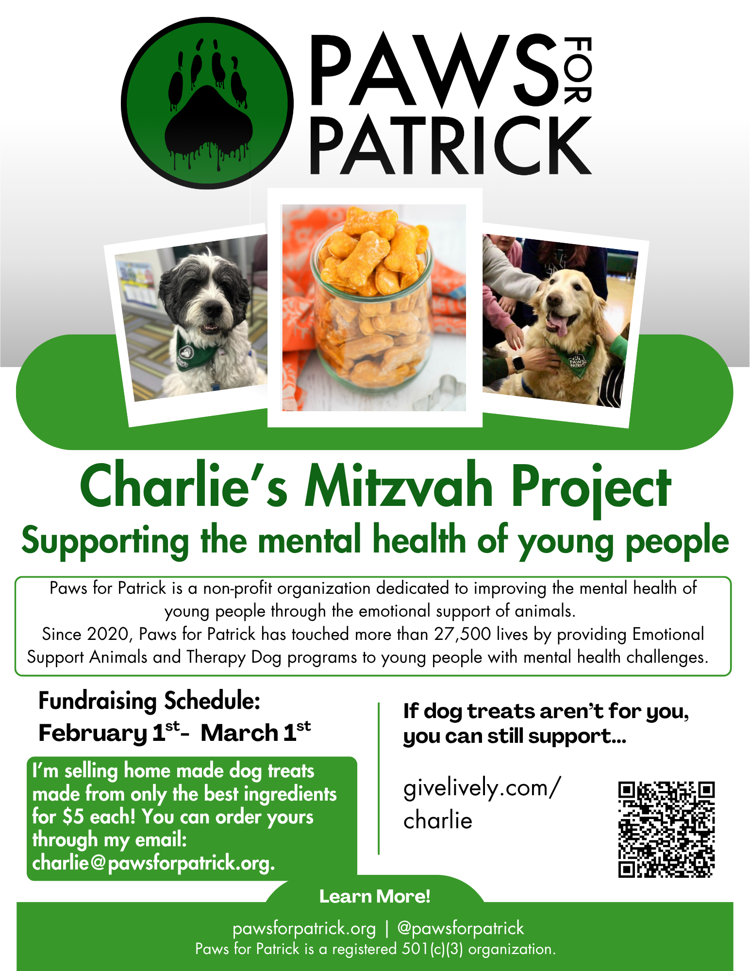 Want to create your own materials? Download the Paws for Patrick logo to use on posters, flyers, social media posts, etc.